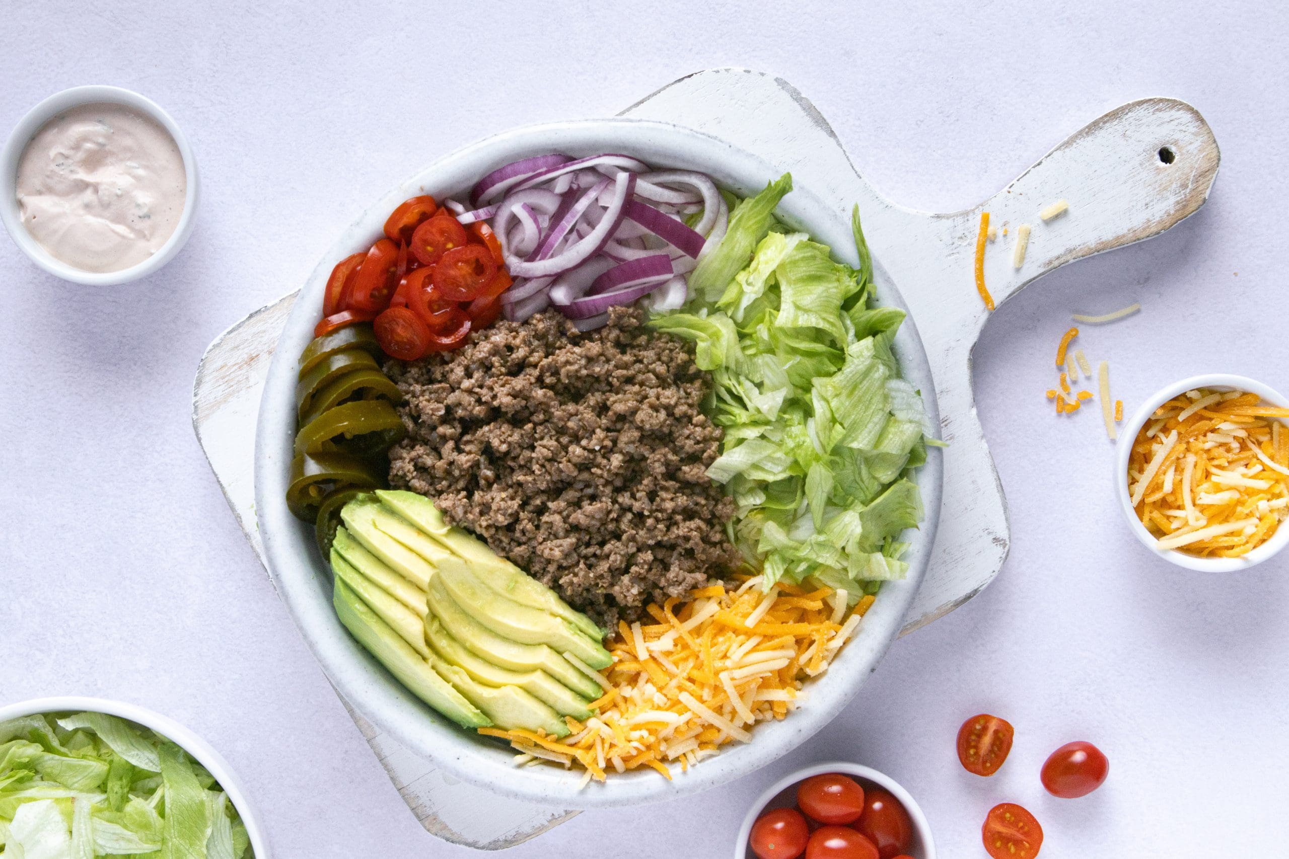 Lavkarbo cheeseburgersalat er en smaksrik salat som er enkel å lage. Dette ble en favorittoppskrift hos oss.