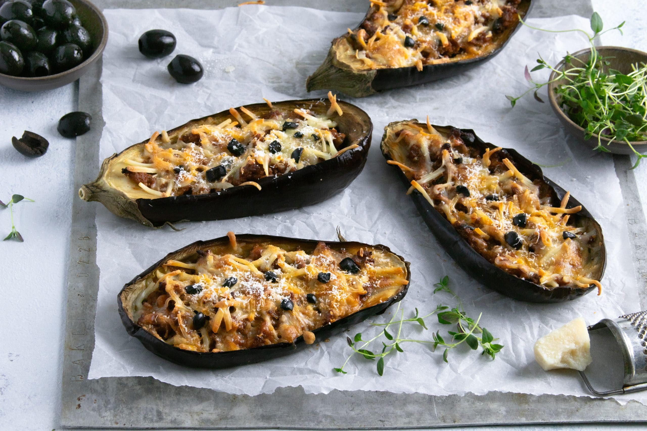 - Legg auberginebåtene tilbake i den ildfaste formen og fyll med kjøttsaus. Strø over revet ost og topp med pizzakrydder.