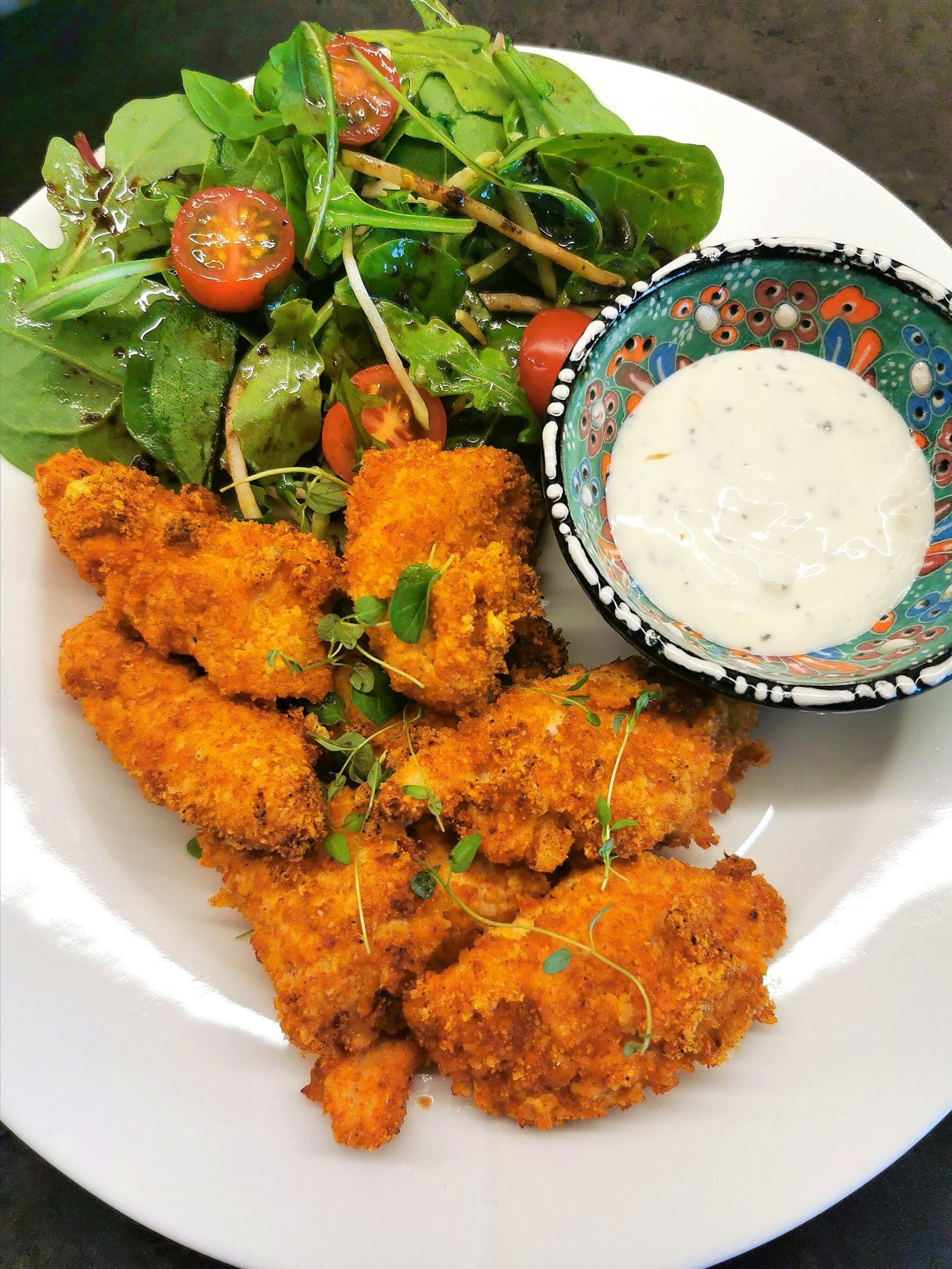 Lavkarbo kyllingnuggets smaker veldig godt sammen med en enkel salat og en god dipp. For eksempel remulade, salsa, hvitløksdressing, ketchup eller en annen dipp du liker.