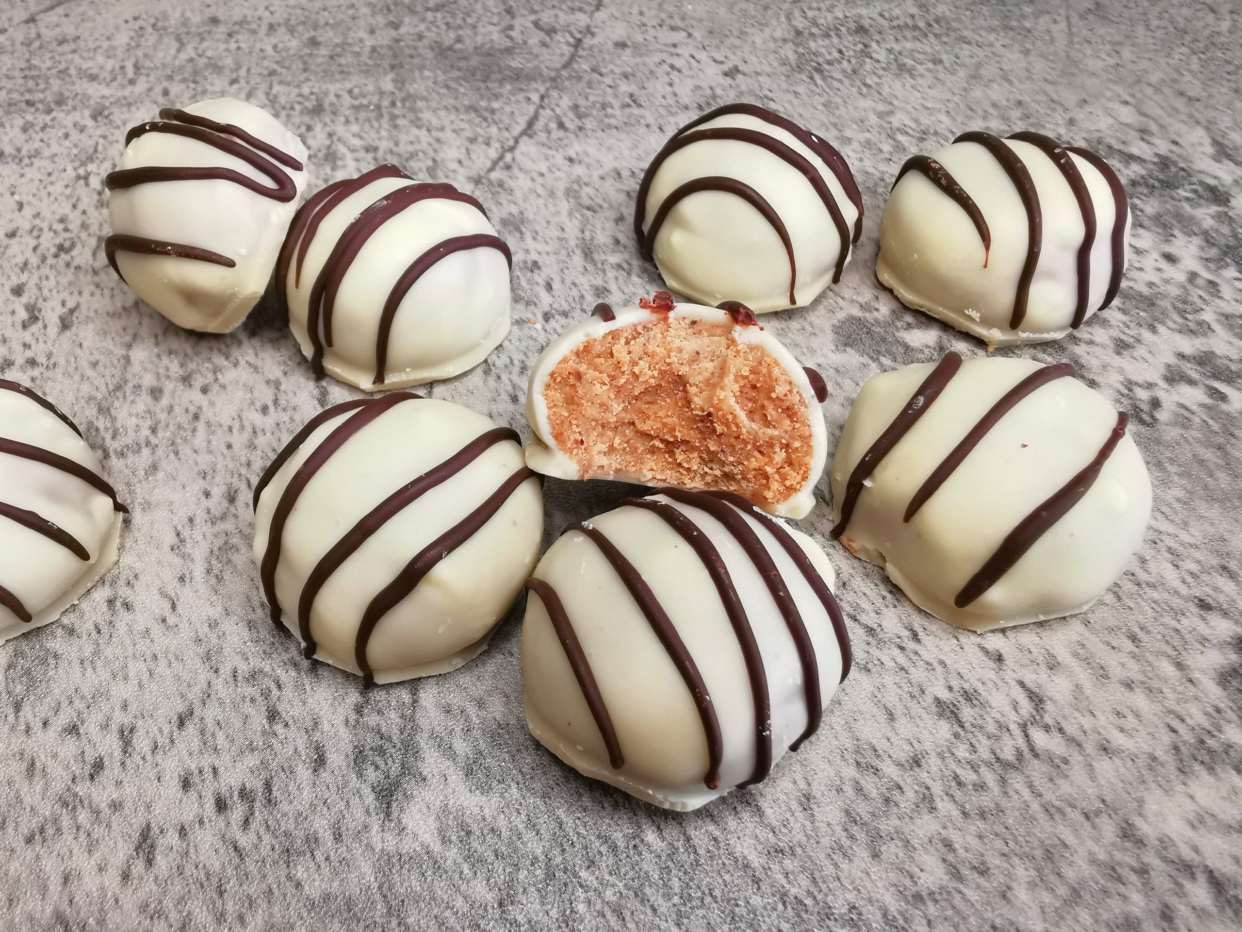 - Dypp kulene i hvit sjokolade og legg de tilbake på bakepapiret. Denne prosessen Gjør du enkelt med to gafler. La de renne godt av seg før du legger de på brettet.