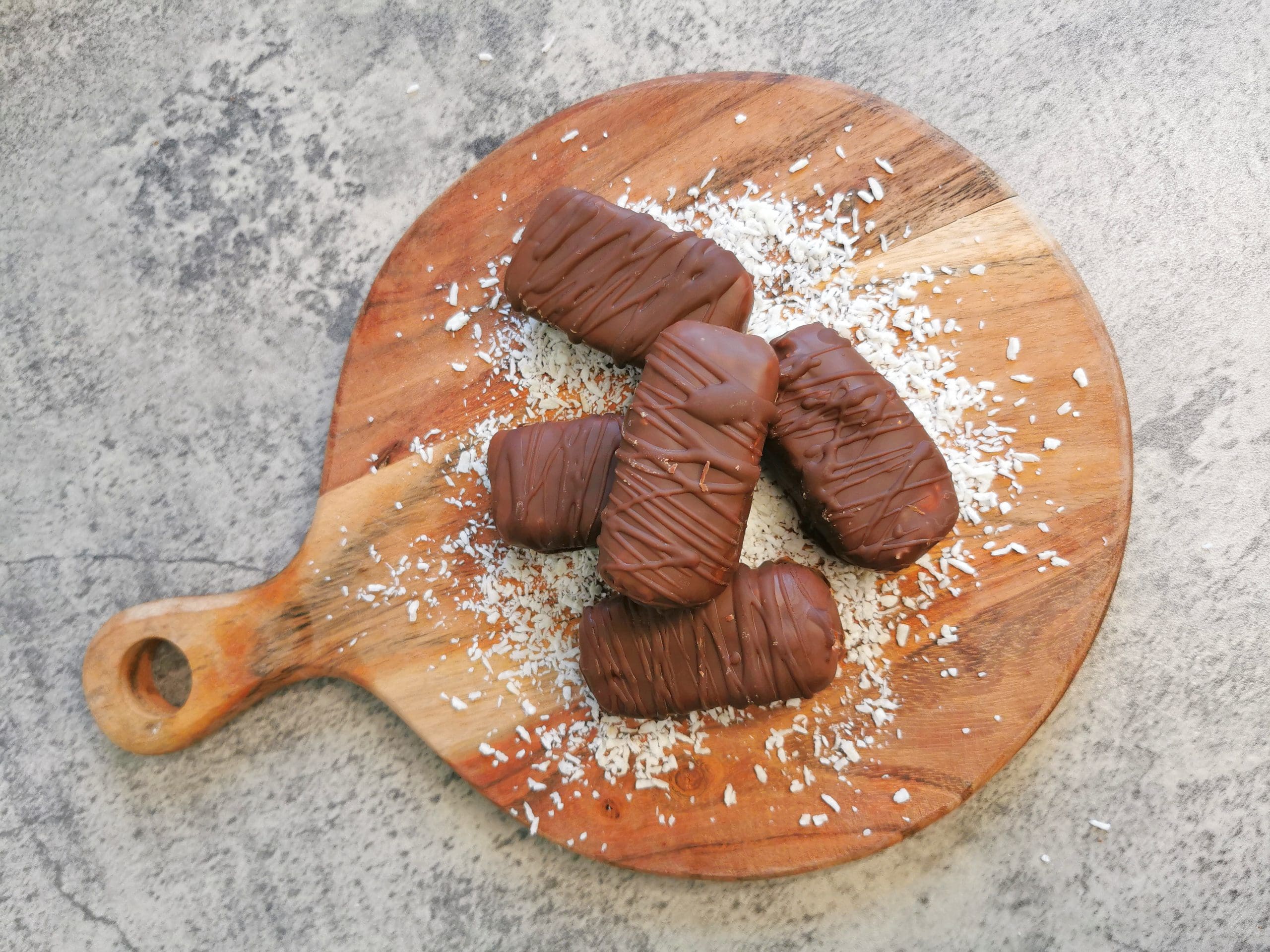 - Dypp den formede kokosmassen i smeltet sjokolade. Legg de ferdig dyppede Bountyene på et bakepapirkledd skjærebrett og sett til avkjøling i kjøleskapet.