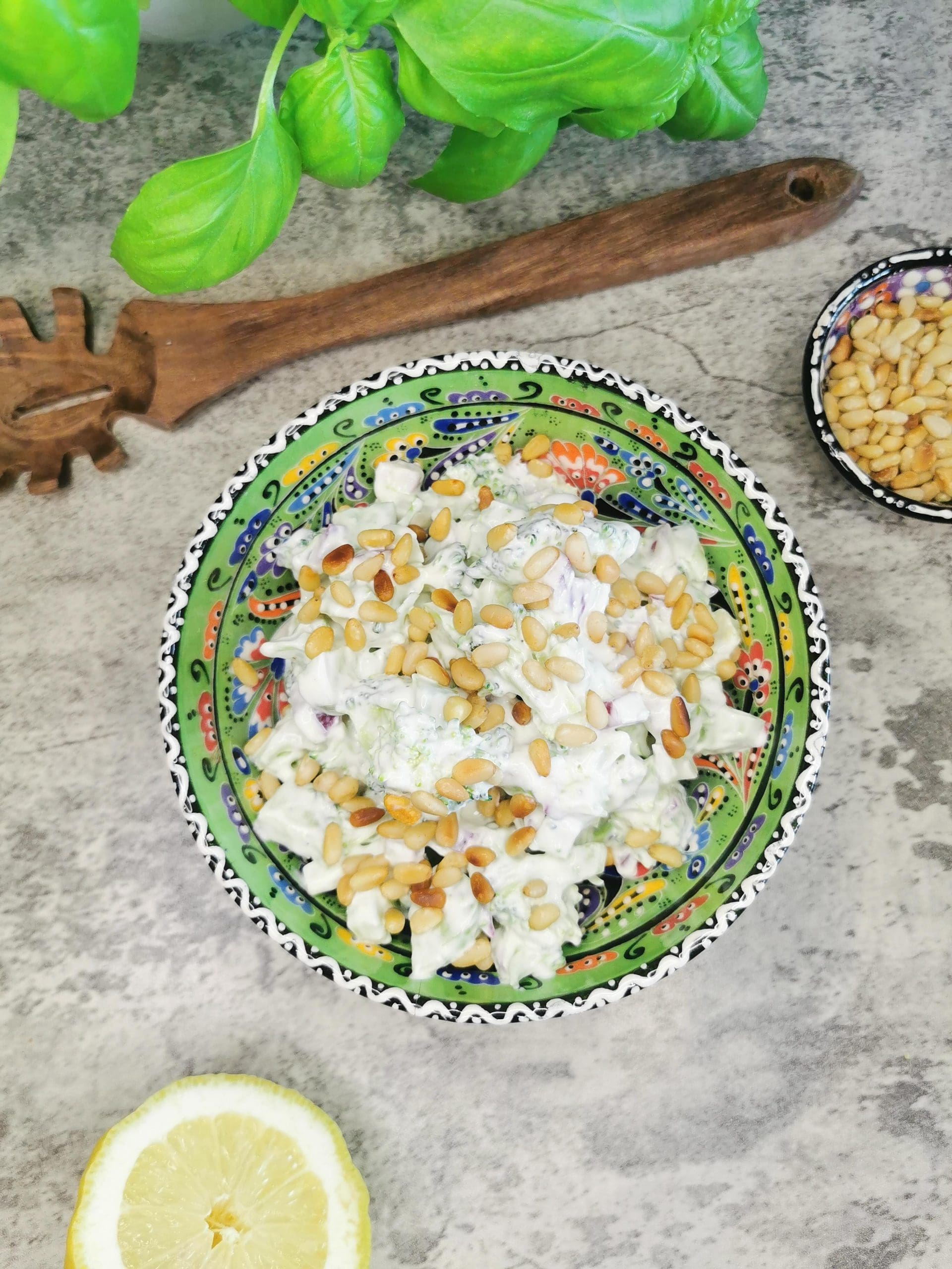- Bland inn i creme fraicheblandingen. Topp med ristede pinjekjerner.