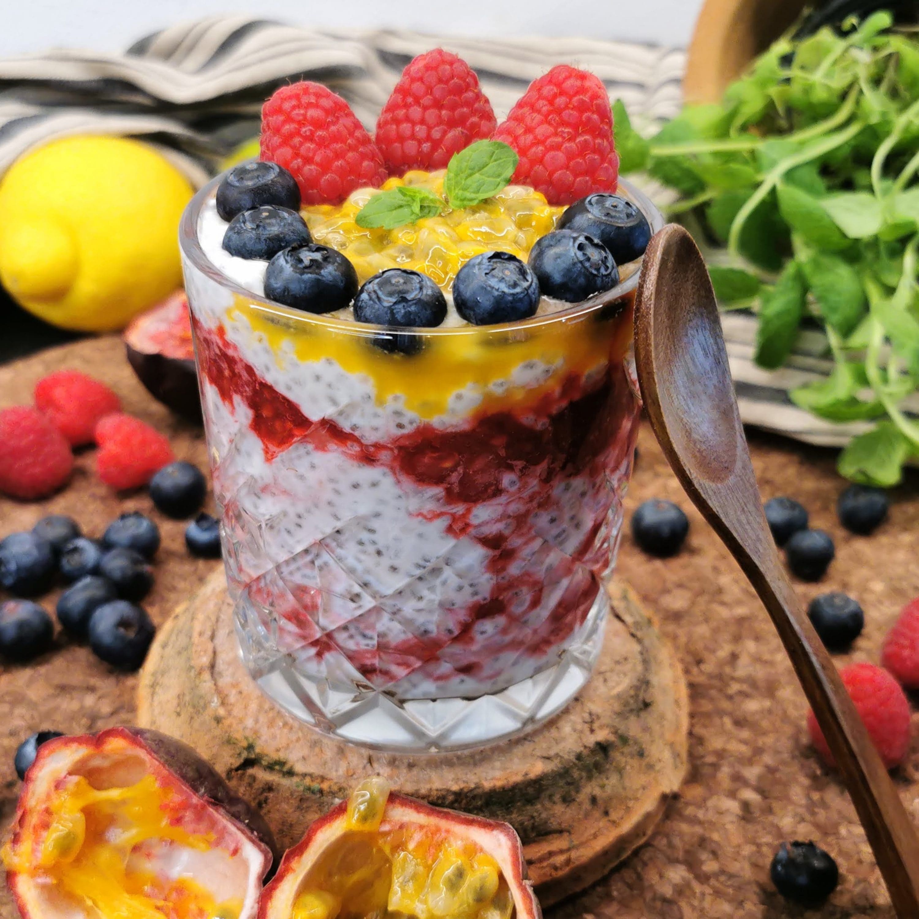 Vi har toppet denne supersunne chiapuddingen med fruktkjøtt fra pasjonsfrukt, friske bringebær og blåbær, og en liten kvast sitronmelisse.