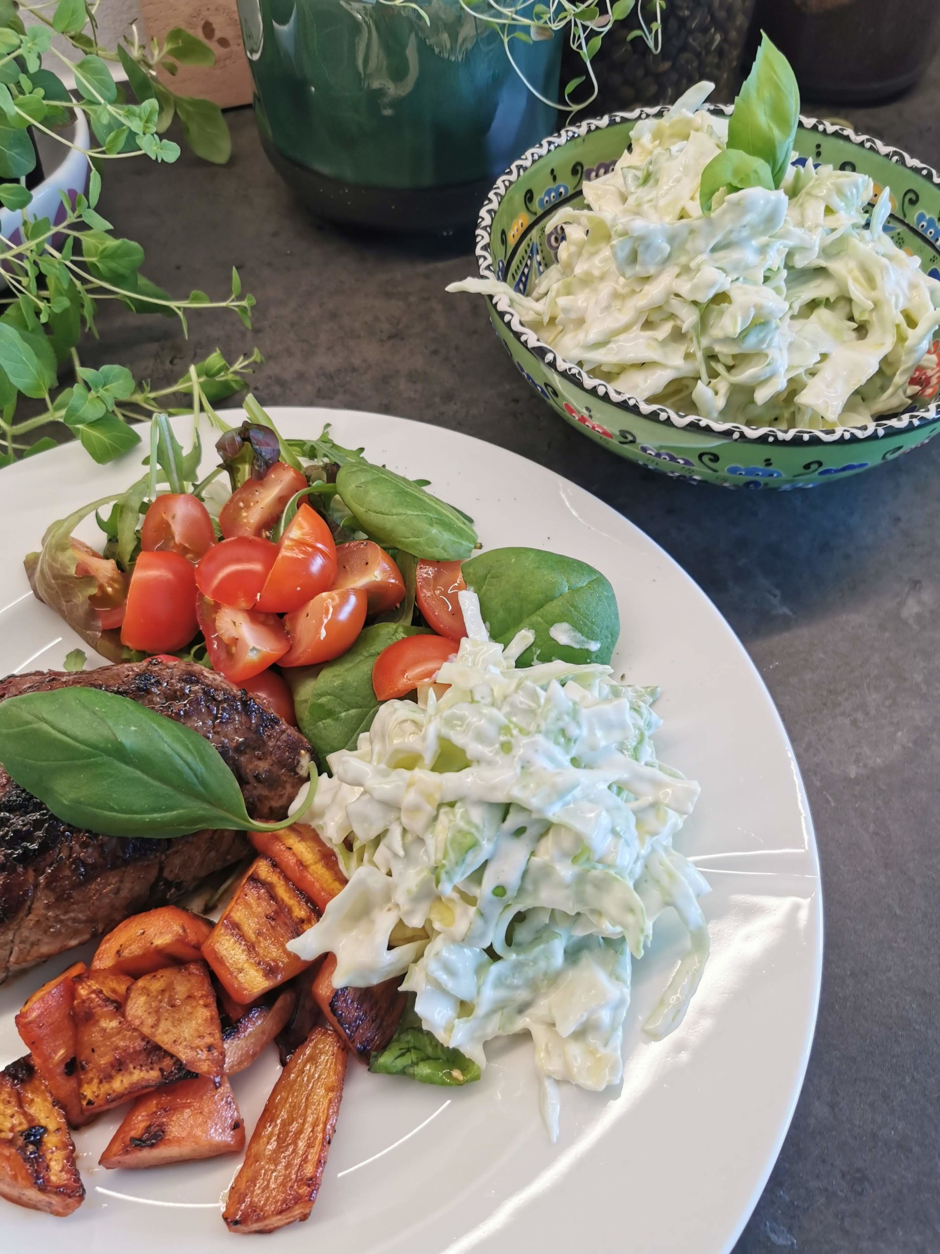 Lavkarbo coleslaw har en kremet og syrlig smak og er perfekt tilbehør til både kjøtt og fisk. Coleslaw er spesielt godt sammen med grillmat og serveres som regel alltid sammen med spareribs, dersom du bestiller dette på restaurant.