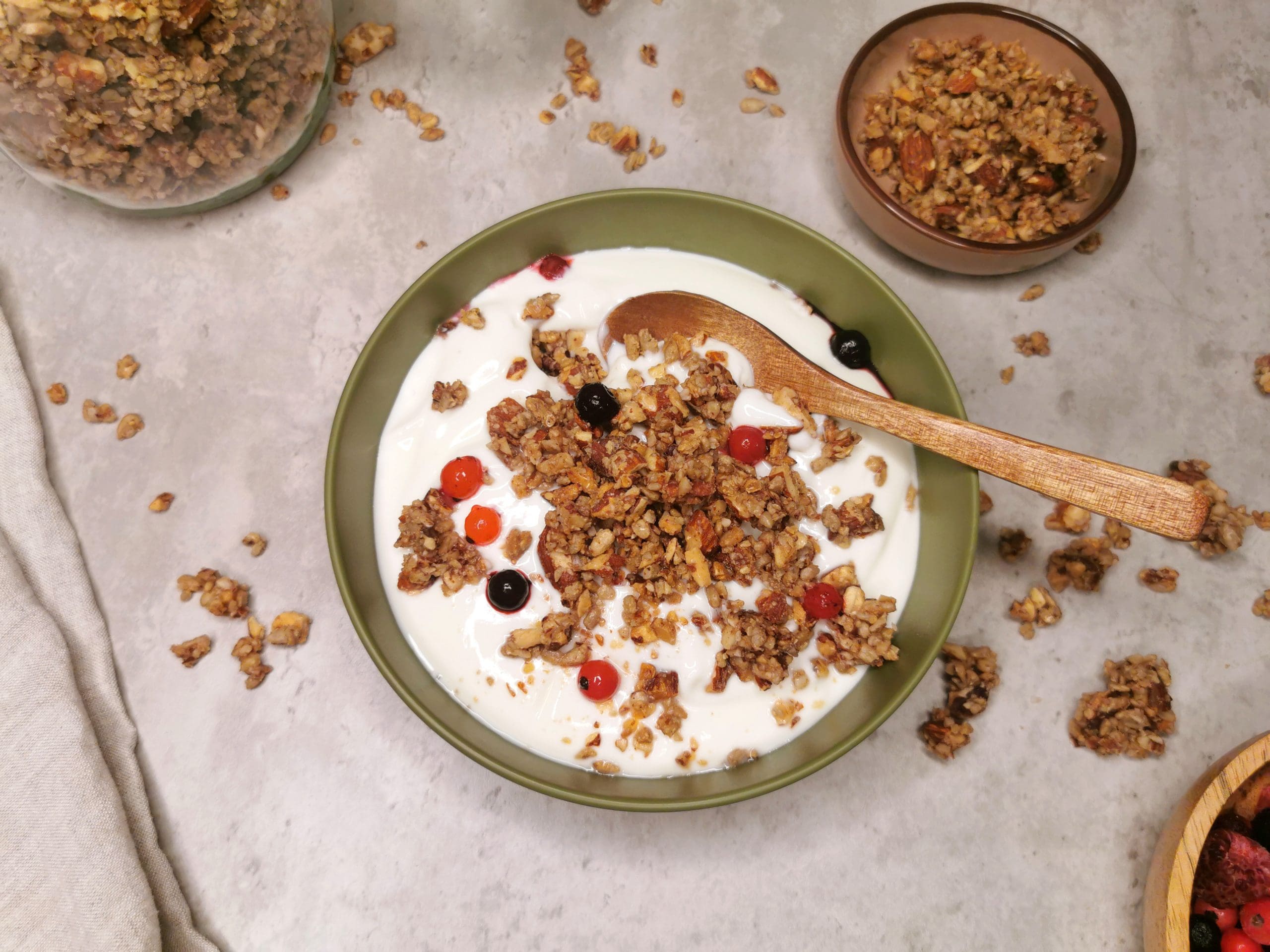 Vi har flere oppskrifter på granola, og de finner du her. Lavkarbo crunchy granola og lavkarbo frokostblanding med eple og kanel.