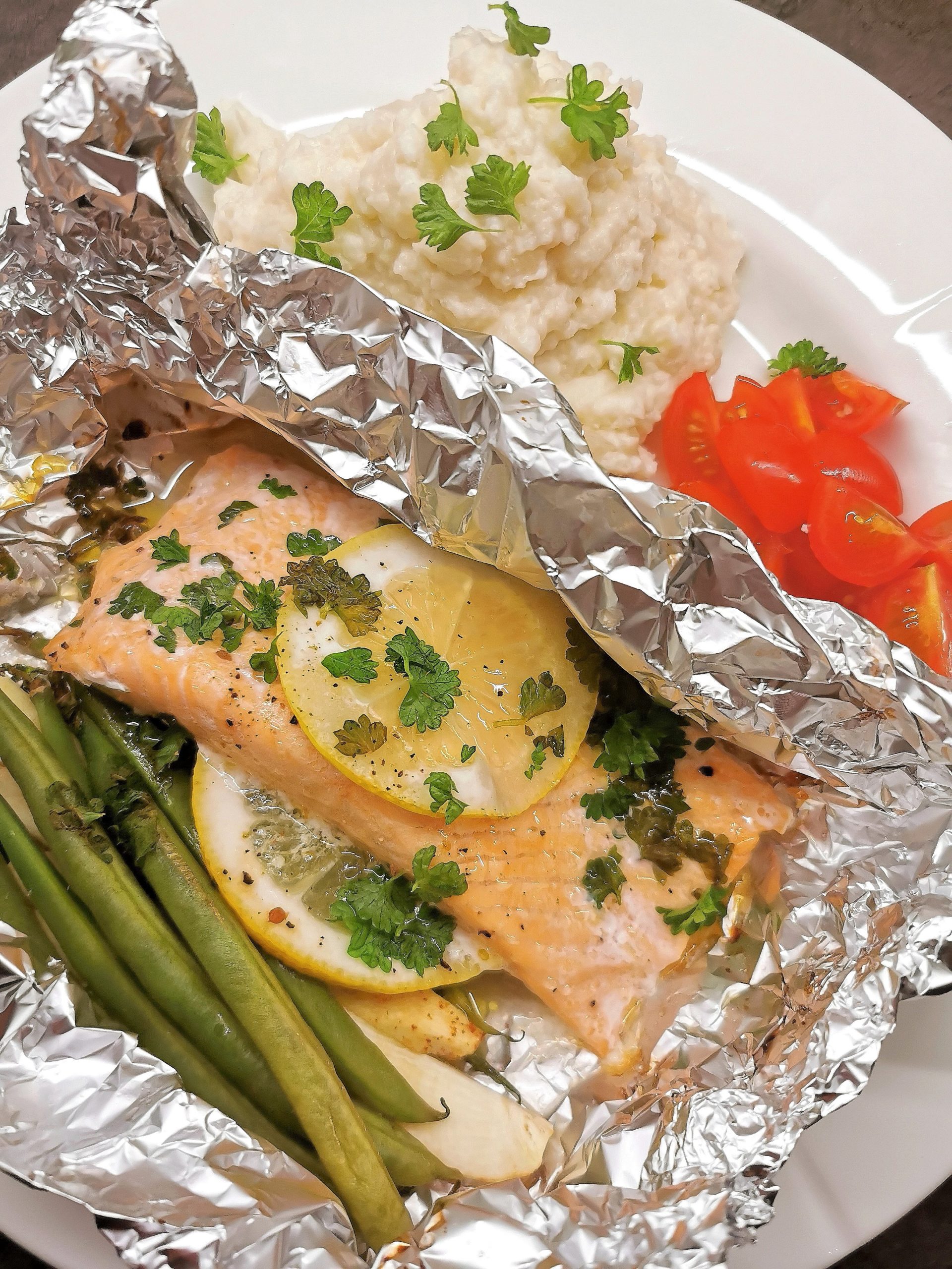 - Skjær sellerirot i tynne strimler og legg sellerirot og aspargesbønner i aluminiumsfolie, sammen med én laksefilet. Krydre laksen med salt og sitronpepper og skvis over litt sitronsaft. Skjær skiver av sitronen og legg over 1-2 sitronskiver. Legg 1 ss smør over fisken. Strø over kruspersille og lukk folien godt, slik at fiskepakken blir helt tett. Lag en-to fiskepakker per person.