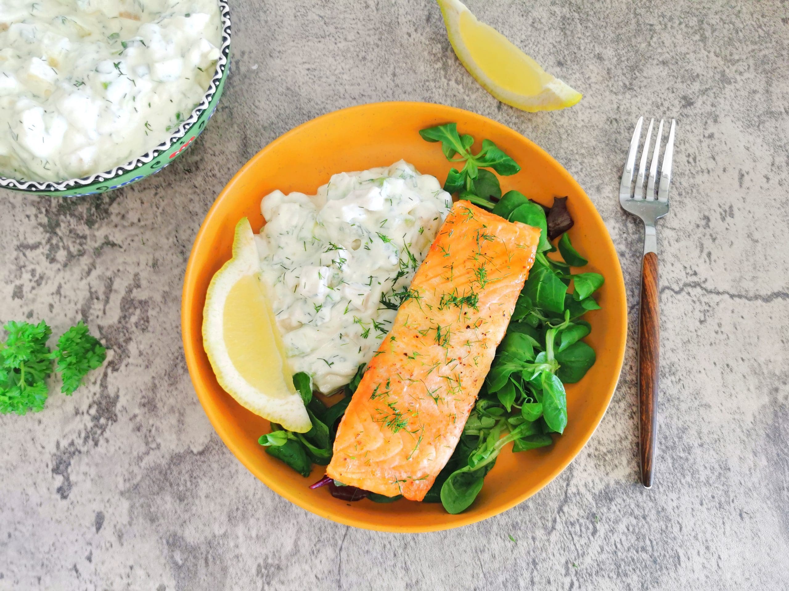 - Server med potetsalat uten potet, grønn salat og sitronbåt. Drys over ferske urter dersom du ønsker det.