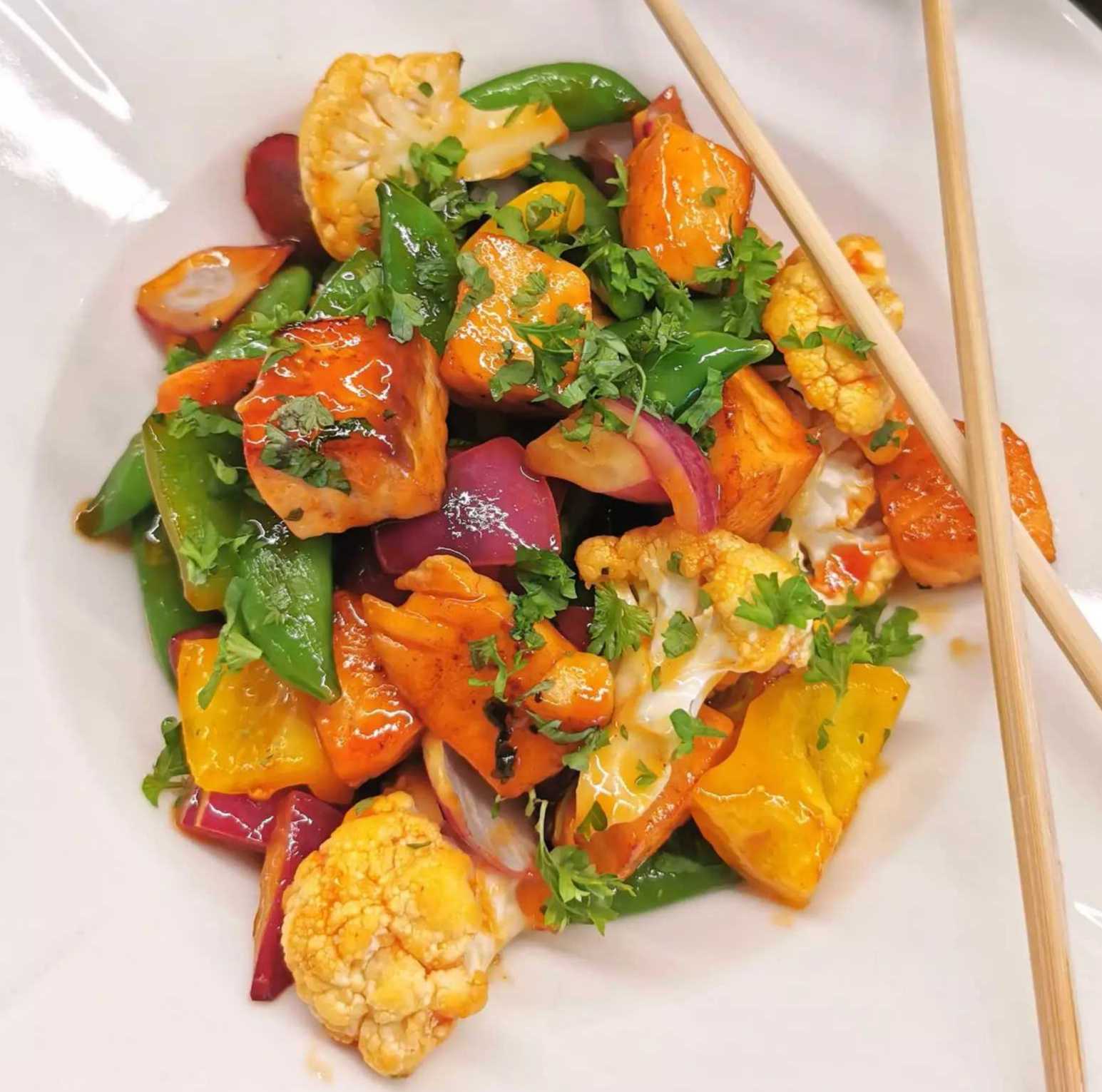 - Tilsett ekstra olje i den samme stekepannen og hell over grønnsakene. Stek grønnsakene på høy temperatur i noen minutter, slik at de blir gjennomvarm men fortsatt er sprø.