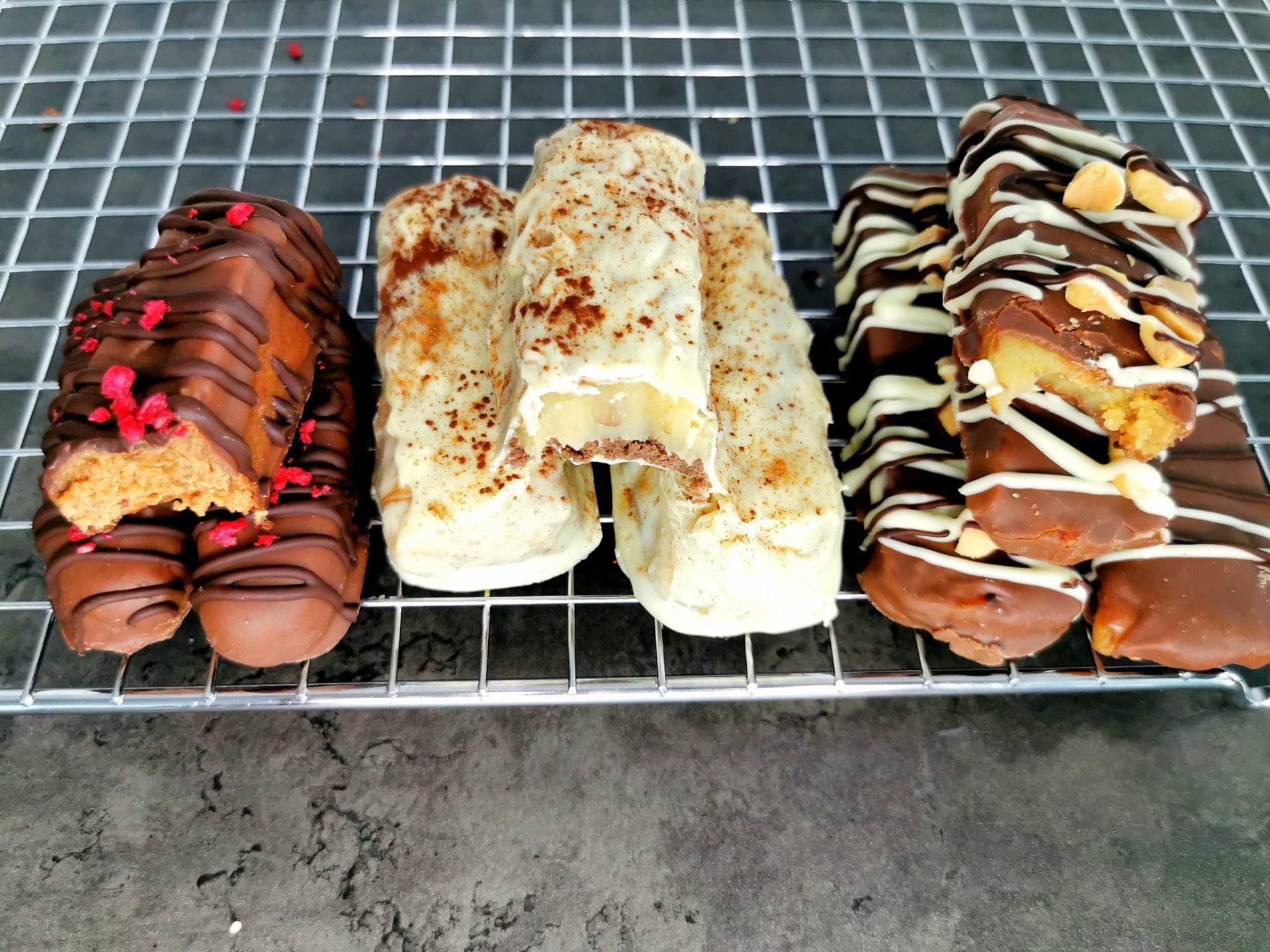 - Dersom du ønsker mønster av sjokolade på baren heller du smeltet sjokolade i en brødpose, klipper av tuppen og sirkler dette over barene.