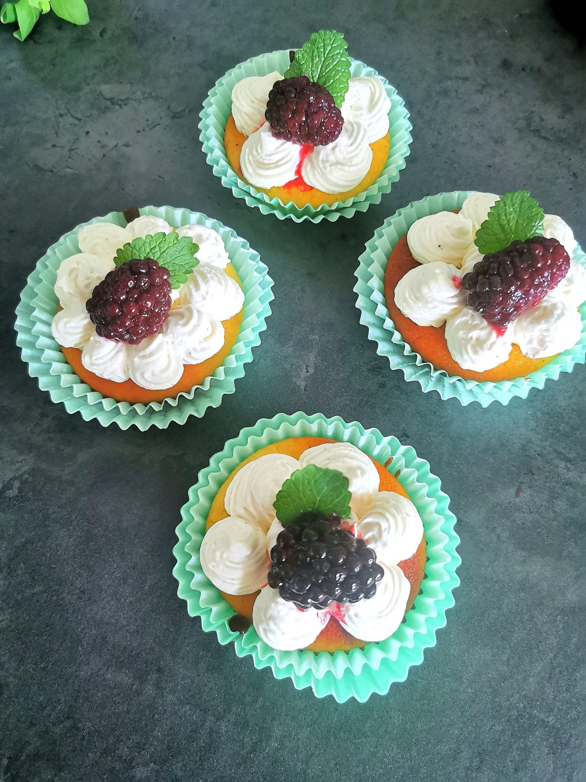 Lavkarbo muffins med sitronkrem, toppet med bjørnebær og sitronmelisse. Saftige og smaksrike muffins. Topp gjerne med andre bær, som jordbær eller bringebær. Du kan også rive sitronskall og toppe sitronkremen med dette. Da får du en enda skarpere sitronsmak av sitronkremen.