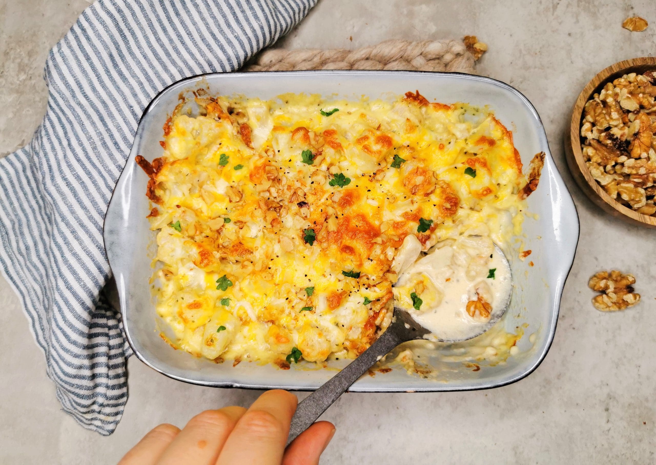 Lavkarbo ostegratinert blomkål med valnøtter (vegetar)