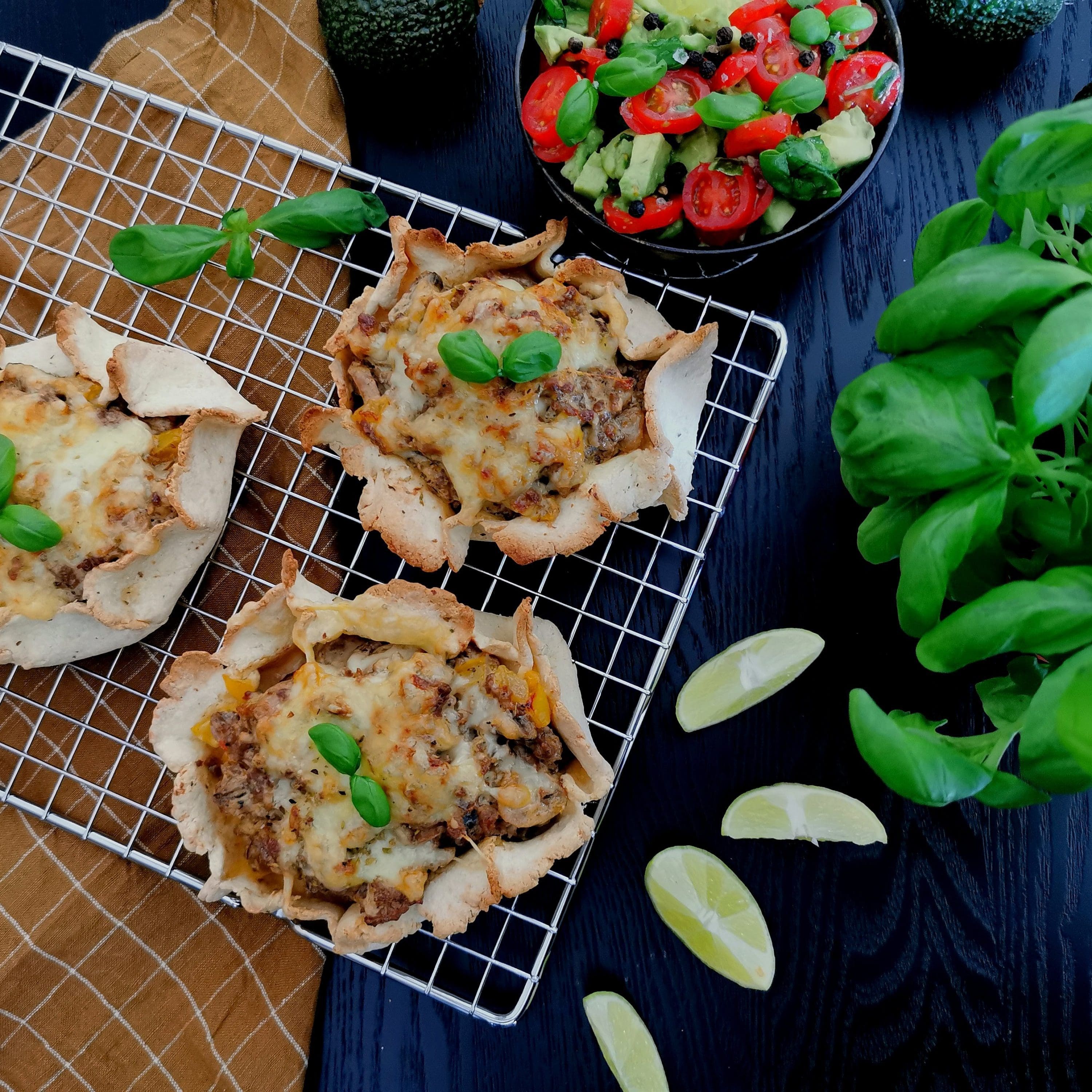 På bildet under ser du lavkarbo piroger servert med en enkel basilikumsalat. Den består av en generøs mengde basilikum, i tillegg til cherrytomater, avocado, olivenolje, salt og pepper. Enkelt men skikkelig godt.