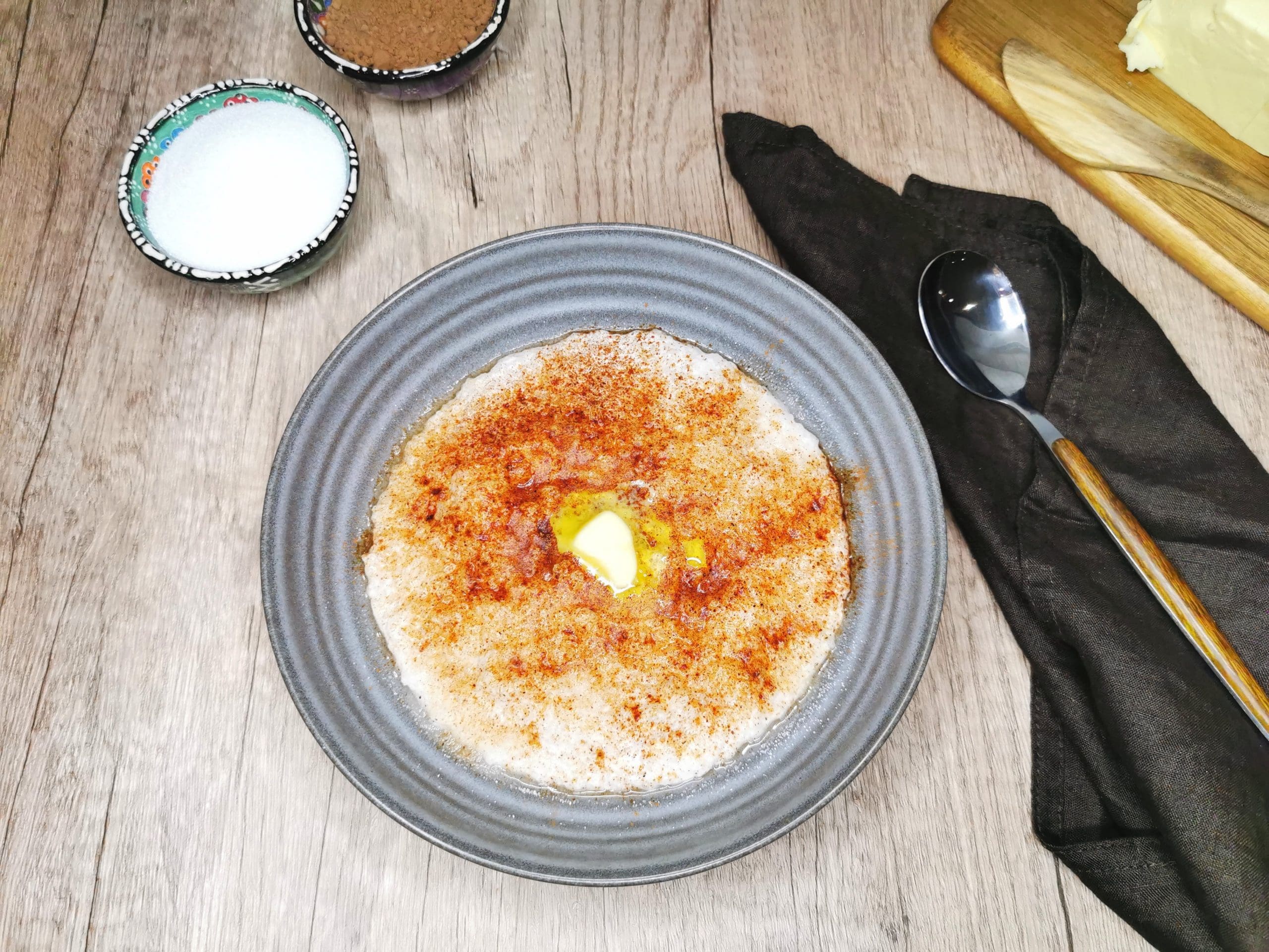 Vi toppet grøten med sukrin:1, kanel og meierismør.
