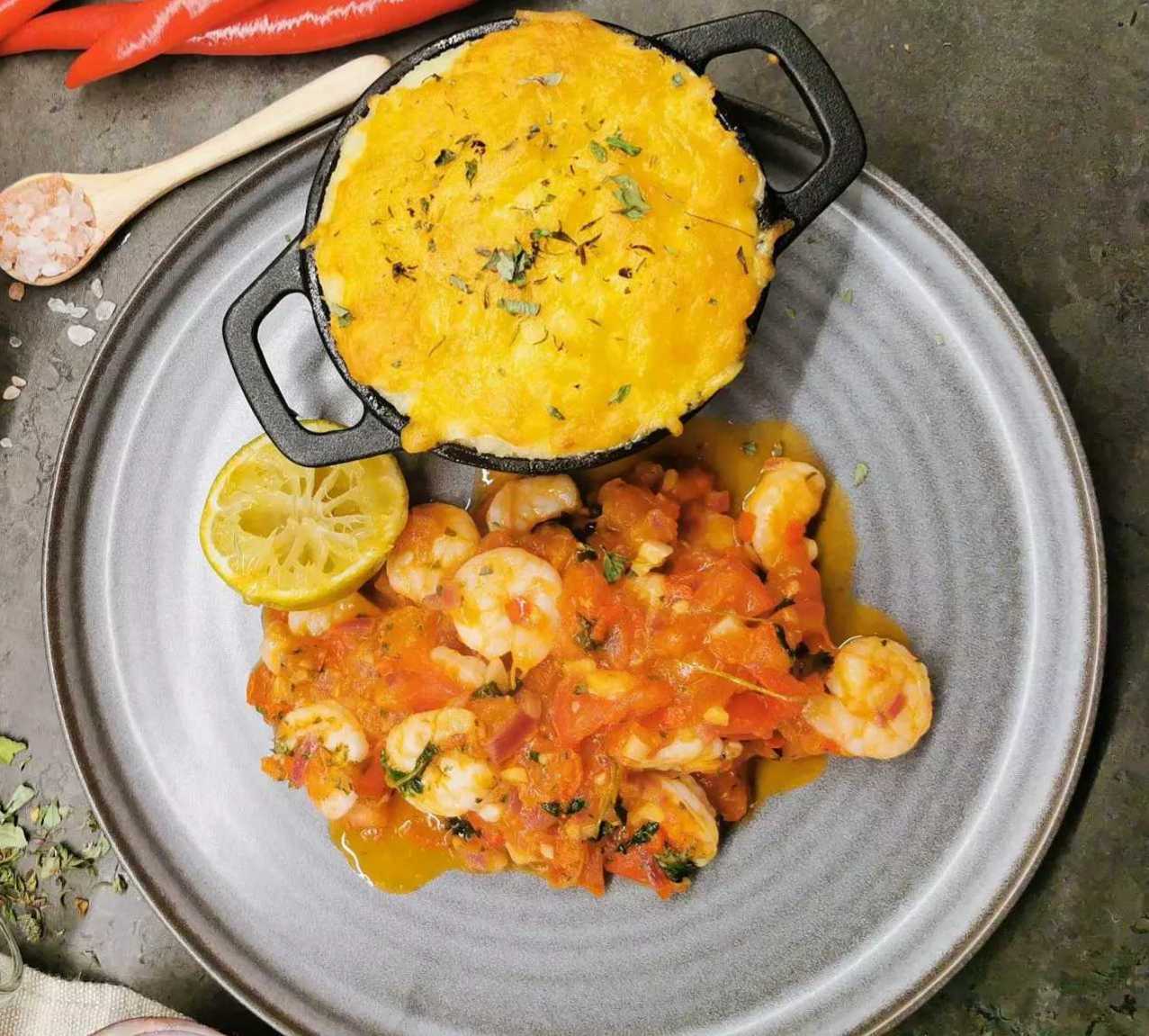 Lavkarbo scampi i tomatsaus med hvitløk, servert med gratinert blomkålpuré