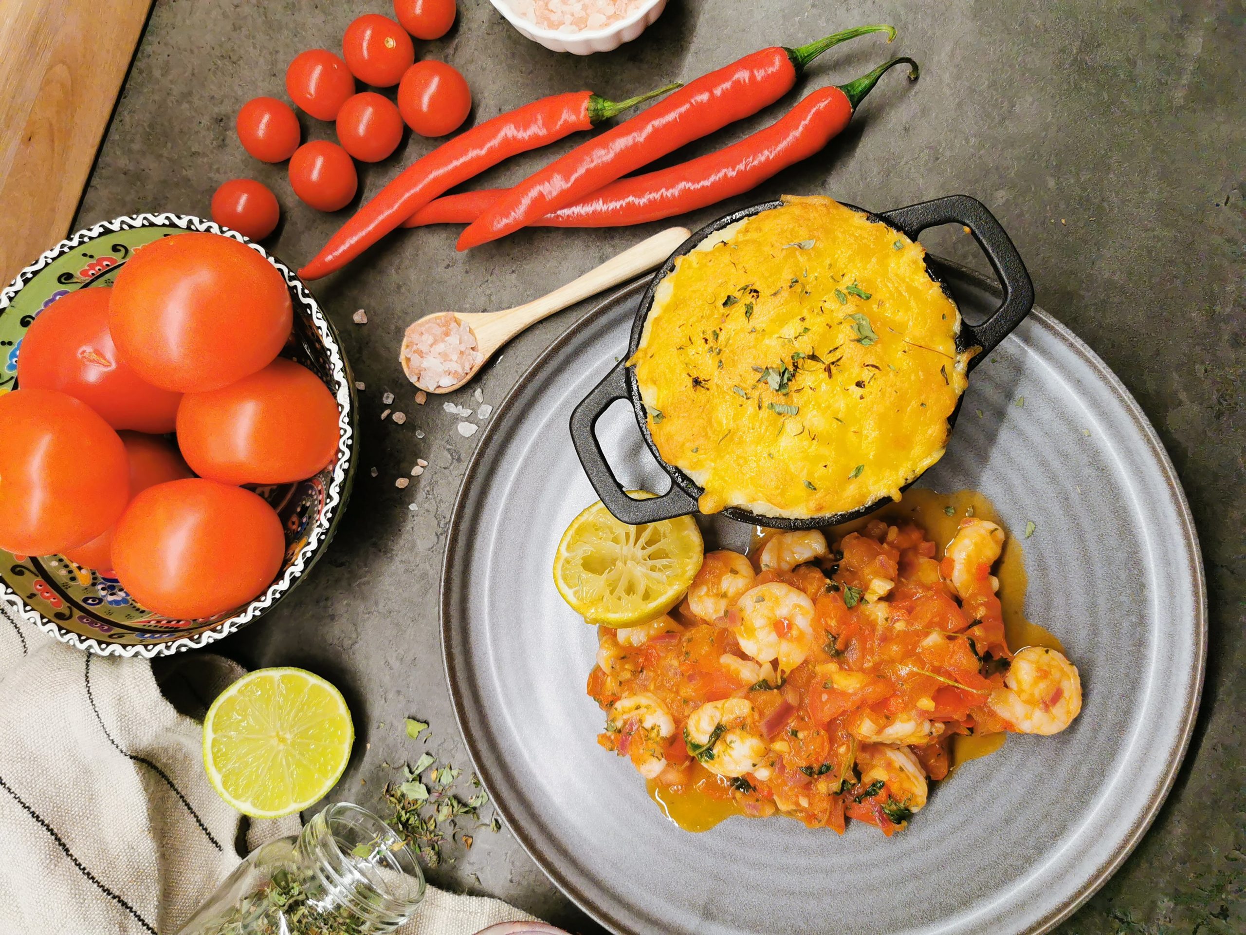 Lavkarbo scampi i tomatsaus med hvitløk, servert med gratinert blomkålpuré