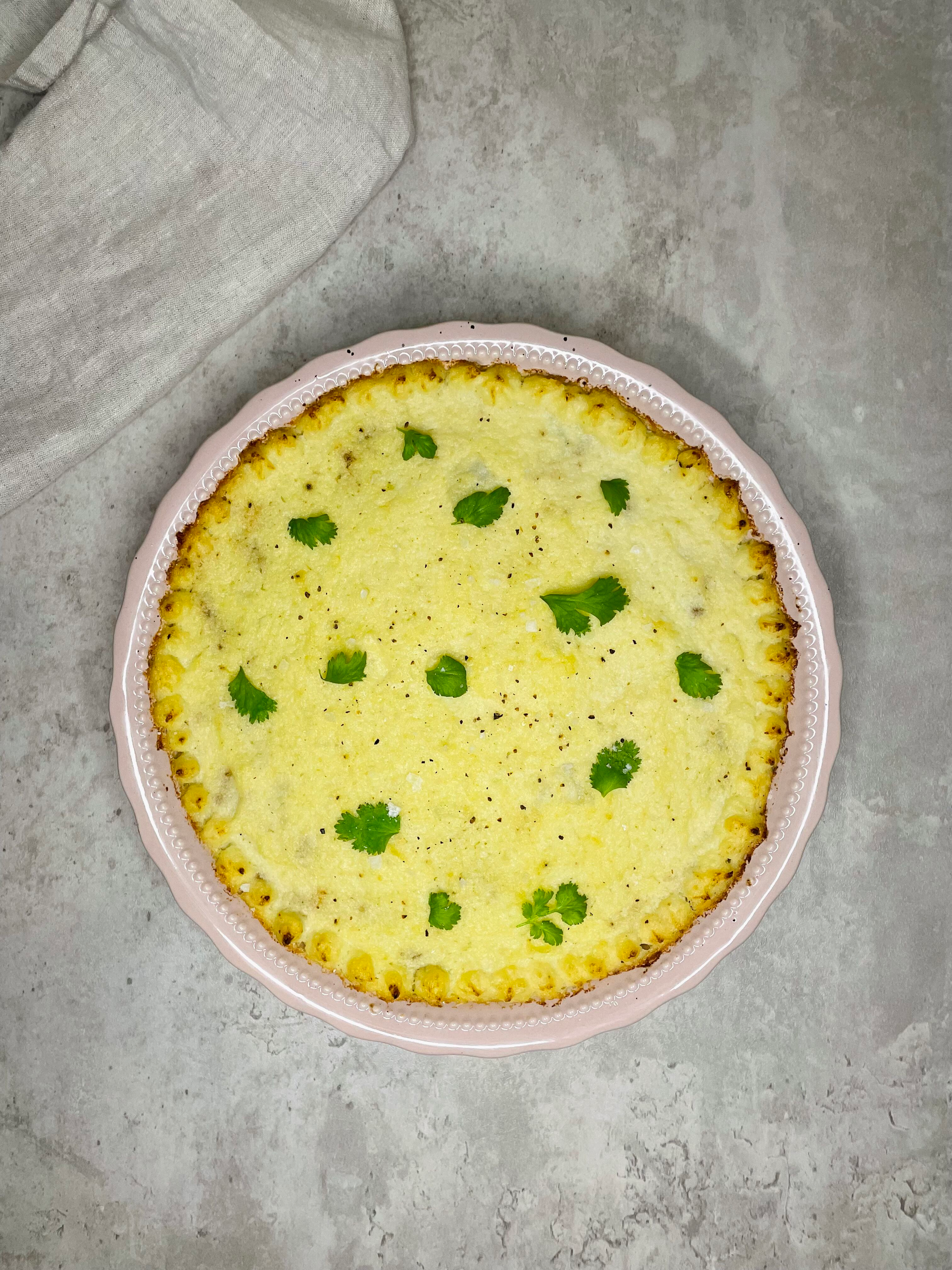 Retten kan også toppes med revet ost, men paien lages tradisjonelt uten revet ost.