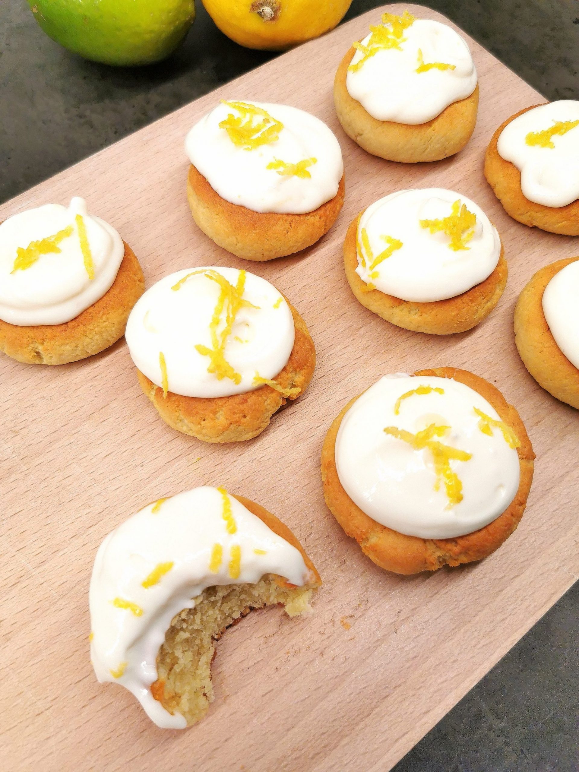 Lavkarbo kjeks med sitronkrem er myke og saftig inni, og kan selvsagt spises uten sitronkrem. Men de blir enda bedre med kremost topping.
