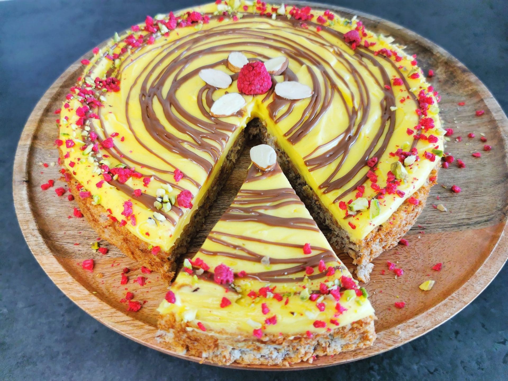 Du kan servere lavkarbo suksessterte helt tradisjonell uten pynt på den gule kremen, eller toppe kremen med for eksempel raspet sjokolade og/eller ferske bær. Vi har pyntet suksessterten med sukkerfri belgisk sjokolade, frysetørket bringebær og pistasjnøtter.