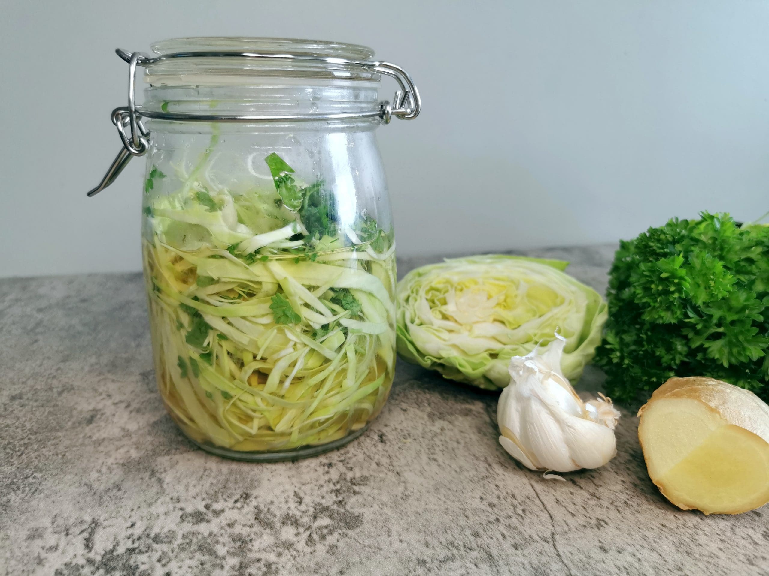 - Snitt kål i tynne strimler og legg på et rent glass med lokk.