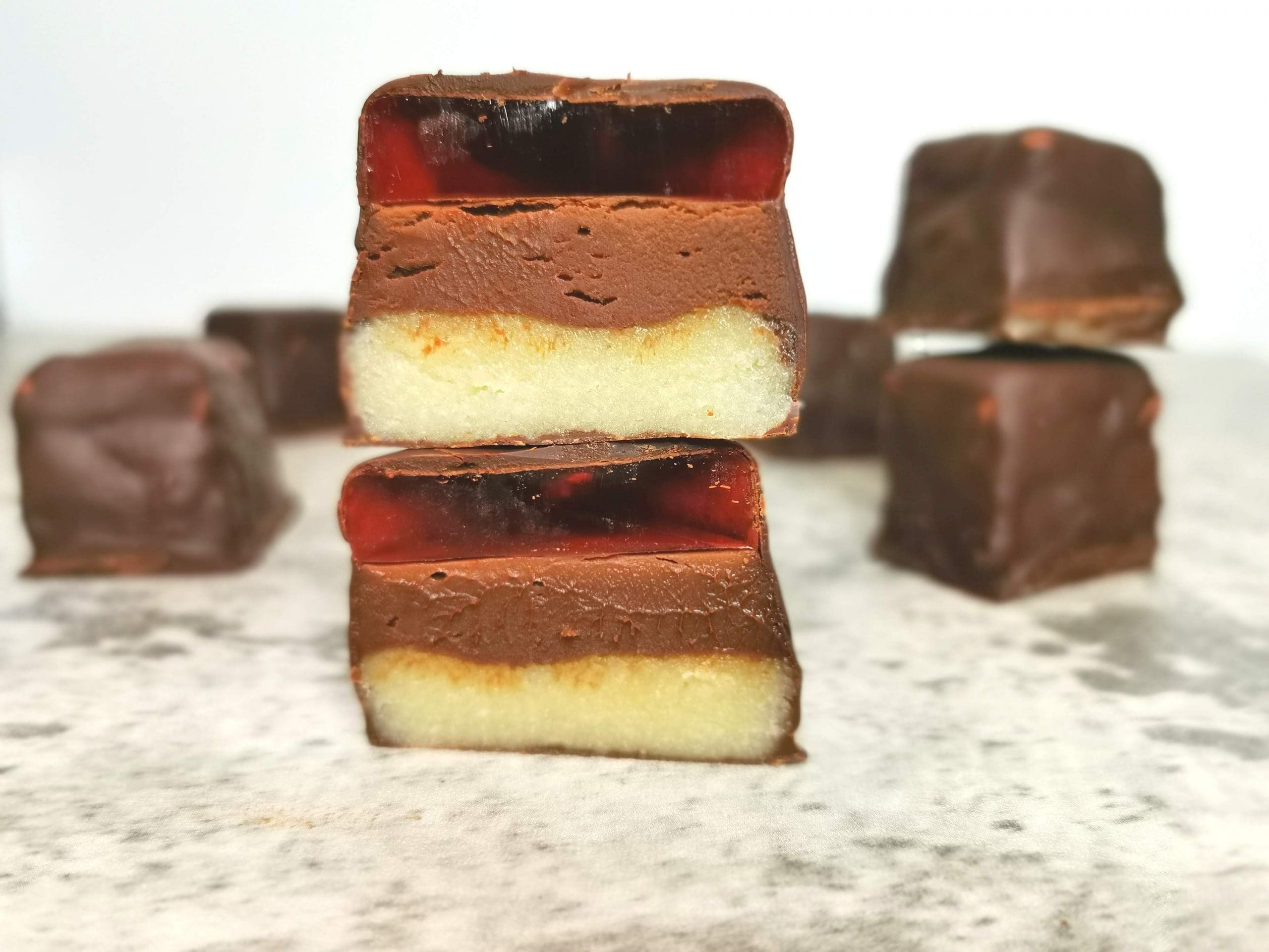 - Smelt sjokolade og kokosolje over vannbad. Avkjøl sjokoladen litt slik at ikke geléen smelter når den dyppes. Dypp bitene i smeltet sjokolade og legg de på et bakepapirkledd brett. Sett kjølig til sjokoladen har stivnet.