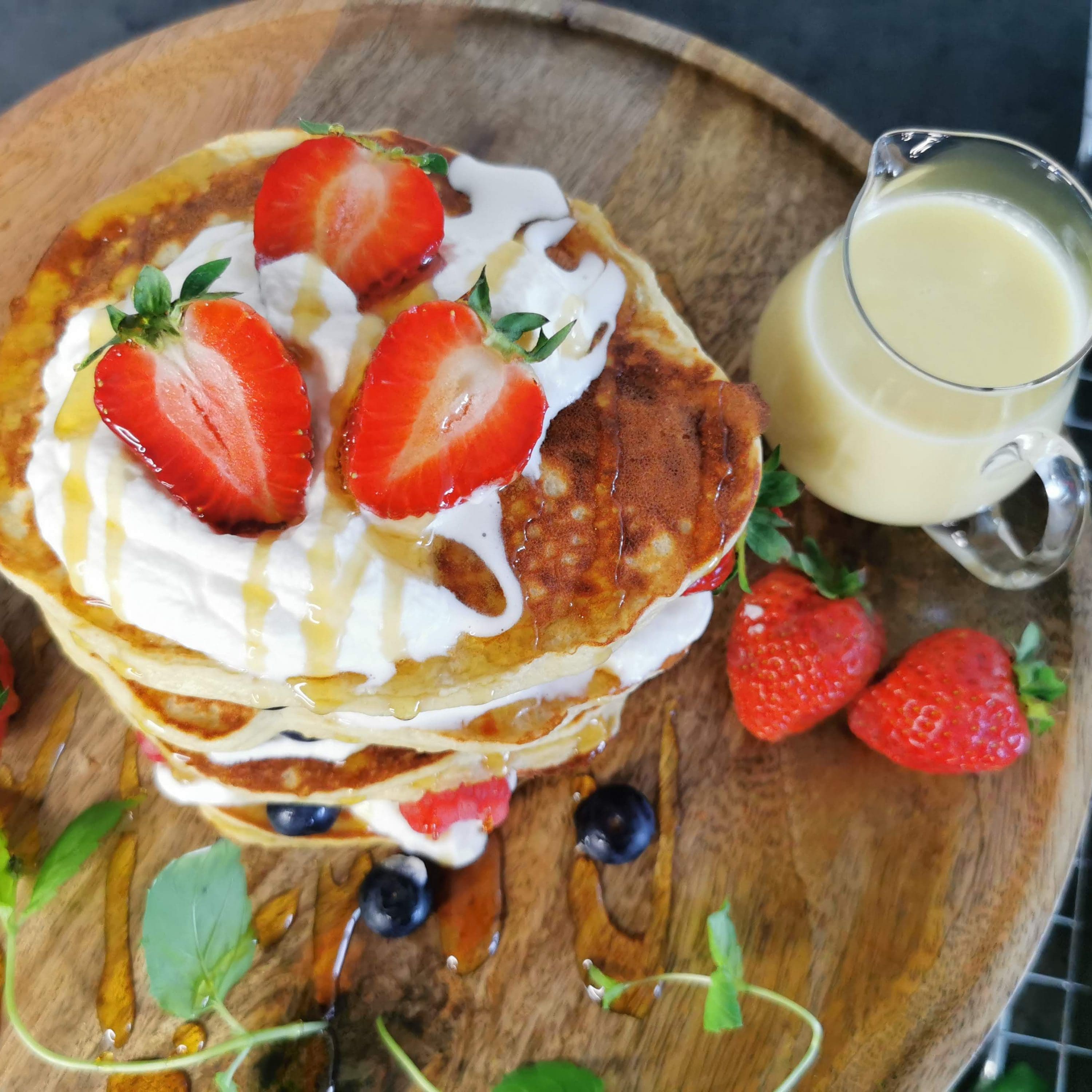 Hva er din favoritt topping på pannekaker? Noen foretrekker smør og søtning, bacon og sirup, eller bær og krem. Syltetøy er også perfekt topping. Vi har valgt bær, krem og lavkarbo hvit sjokoladesaus på våre pannekaker. Dette smakte nydelig!