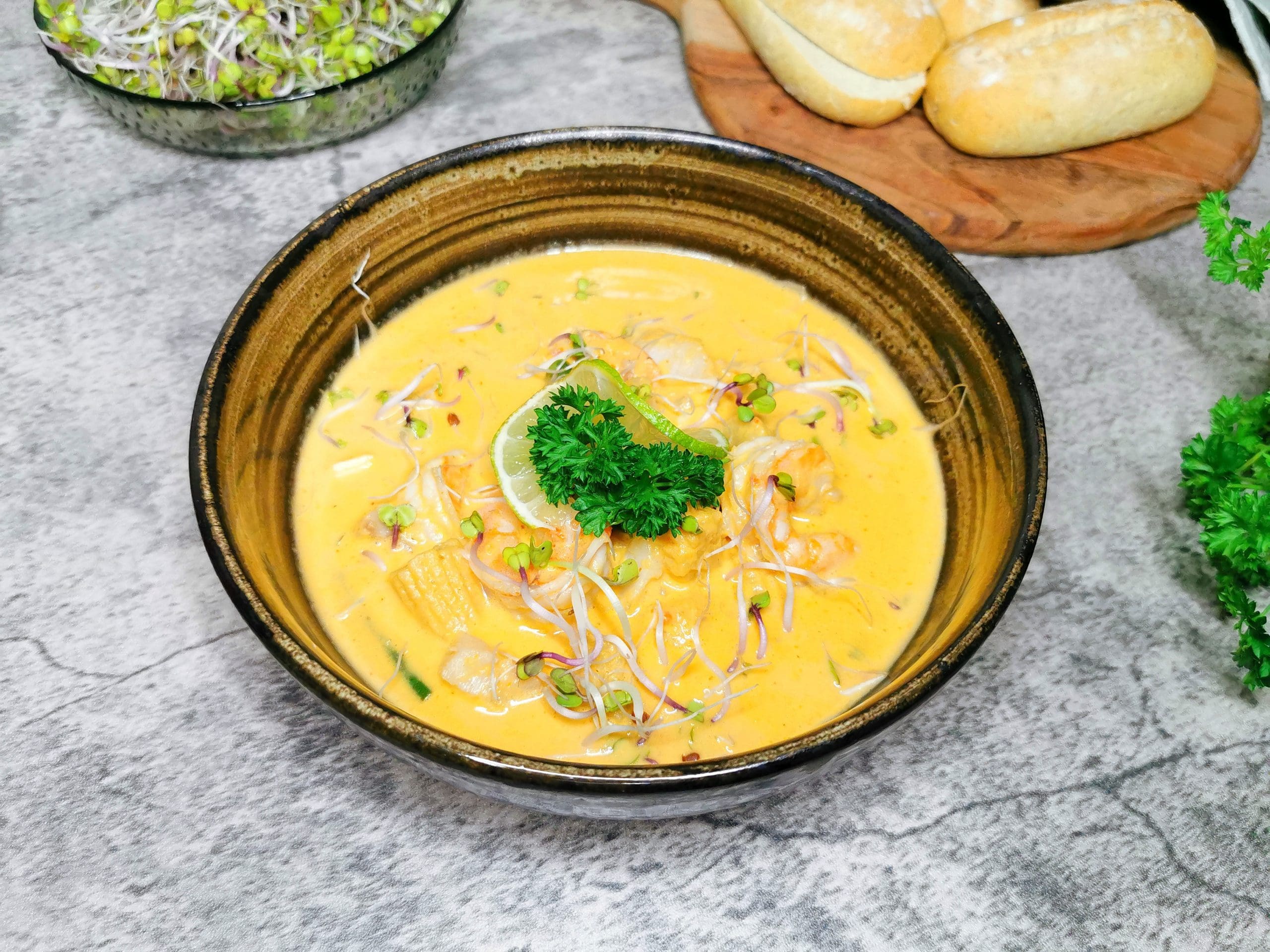 Har du ferske urter for hånd, er det nydelig å strø over for eksempel timian, koriander eller basilikum. Vi serverte suppen med reddik spirer, kruspersille og limebåter. Reddik spirer er sterkt og du trenger bare noen få spirer for å få litt ekstra spicy smak.